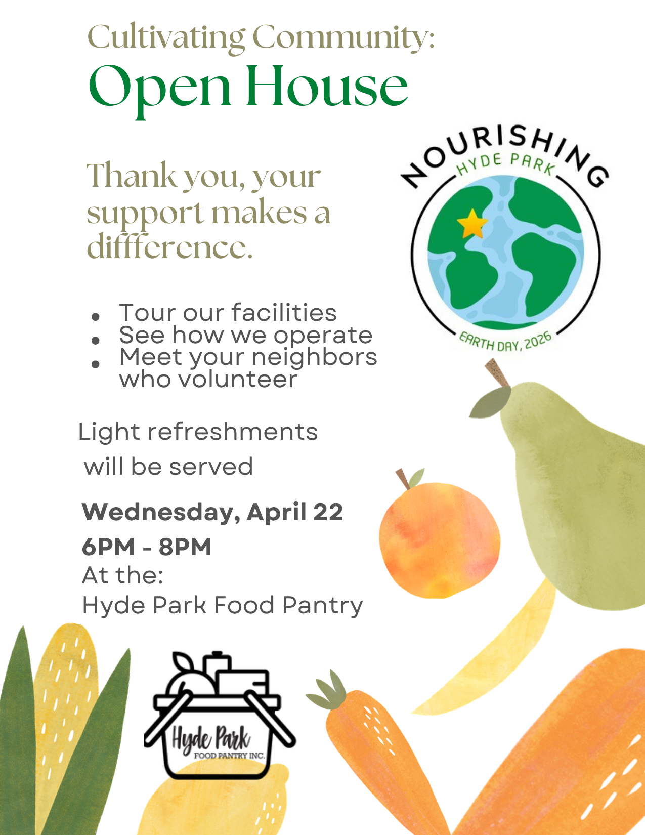 Join us for a welcoming Open House at the Hyde Park Food Pantry to tour the facility, meet volunteers, and see how we support our community. Enjoy light refreshments while discovering ways to get involved and make a meaningful local impact.